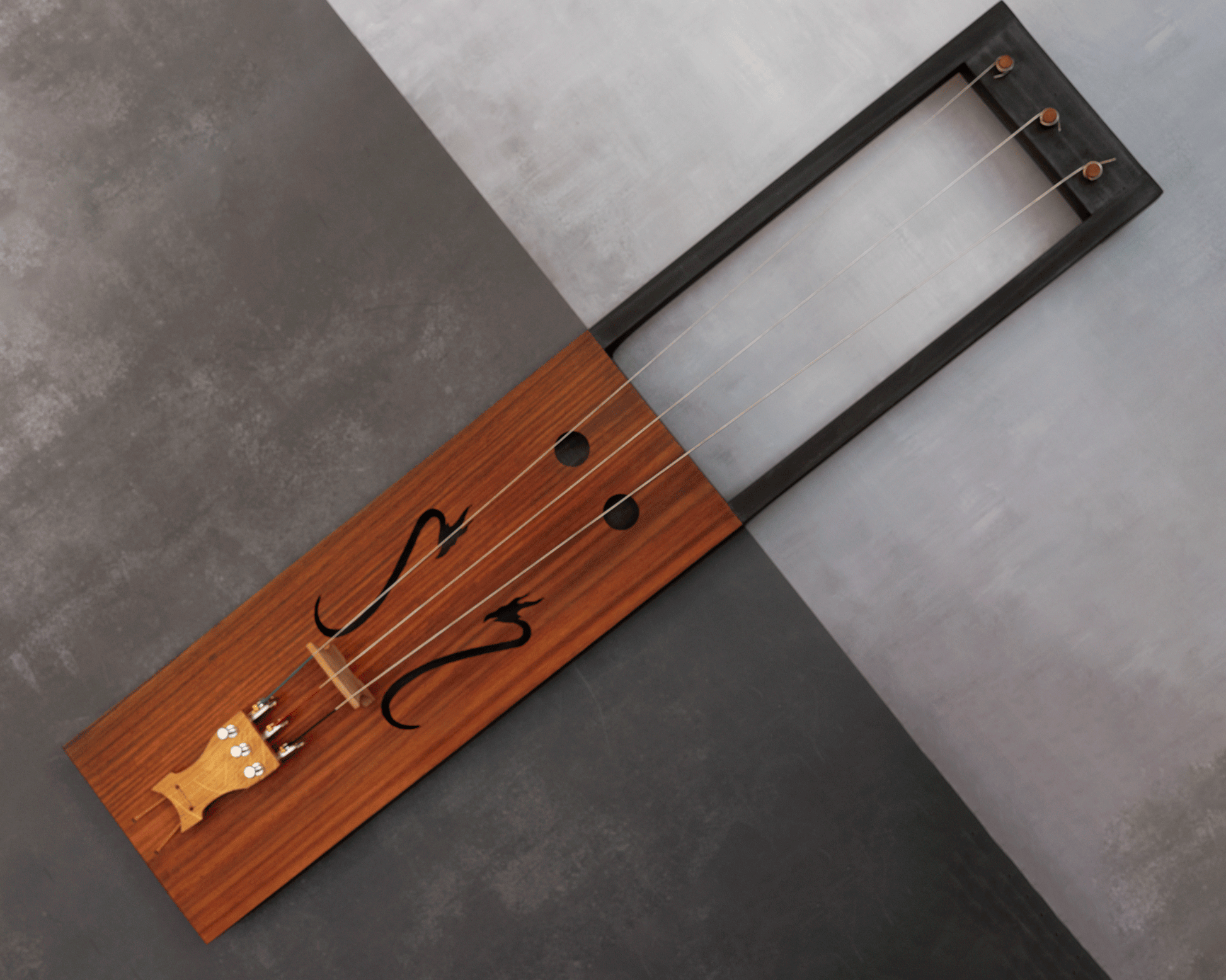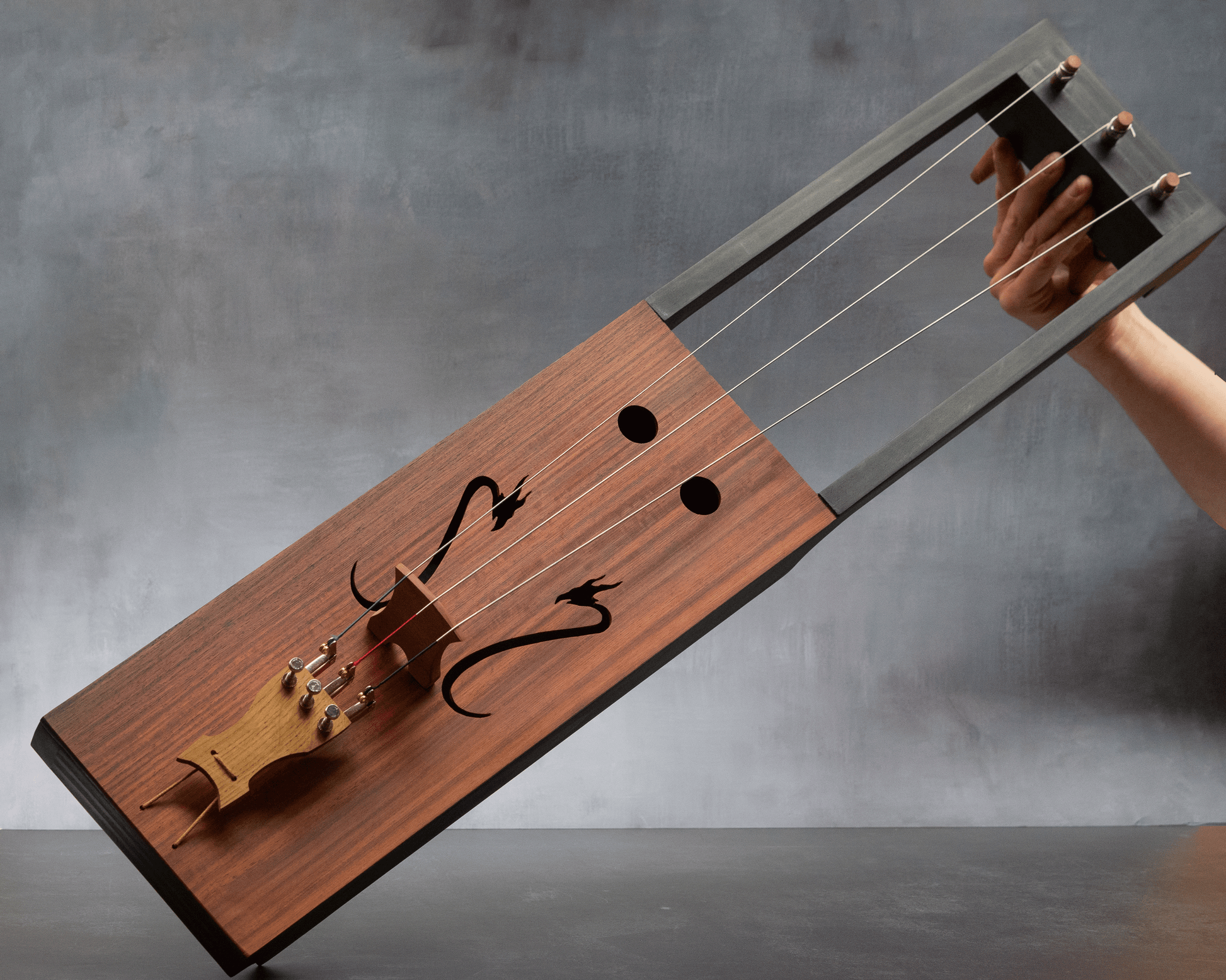 La Bassharpa Draco es una versión totalmente personalizada en base a los requerimientos del cliente, en este caso nuestro cliente eligió la forma, tapa, acabado, clavijas, efes y tipo de cuerdas.